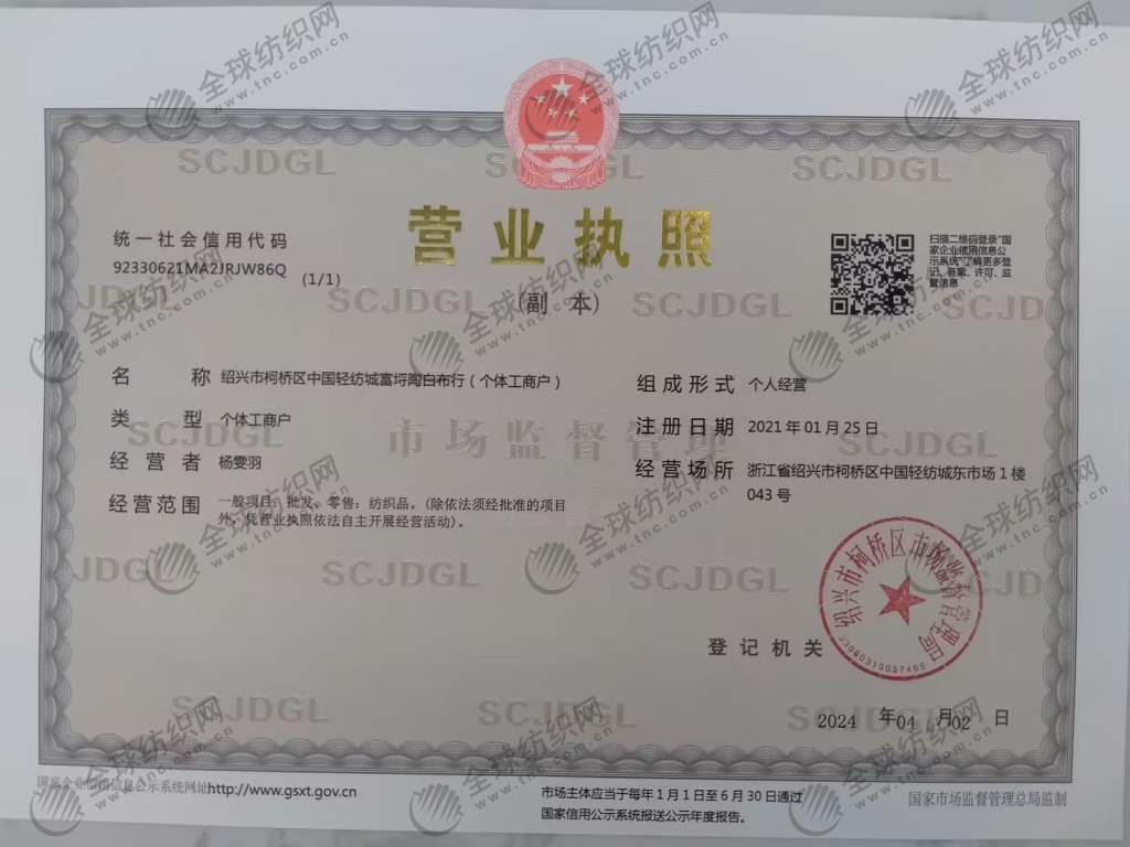 | 营业场所: | 浙江省绍兴市柯桥区中国轻纺城东市场1楼043号 | 营业者姓名: | 杨雯羽 |